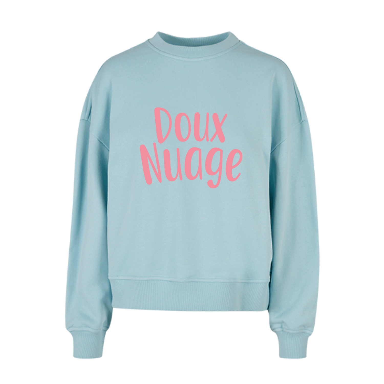 Sudadera sin capucha azul cielo con estampado de terciopelo rosa (“Doux nuage”).
