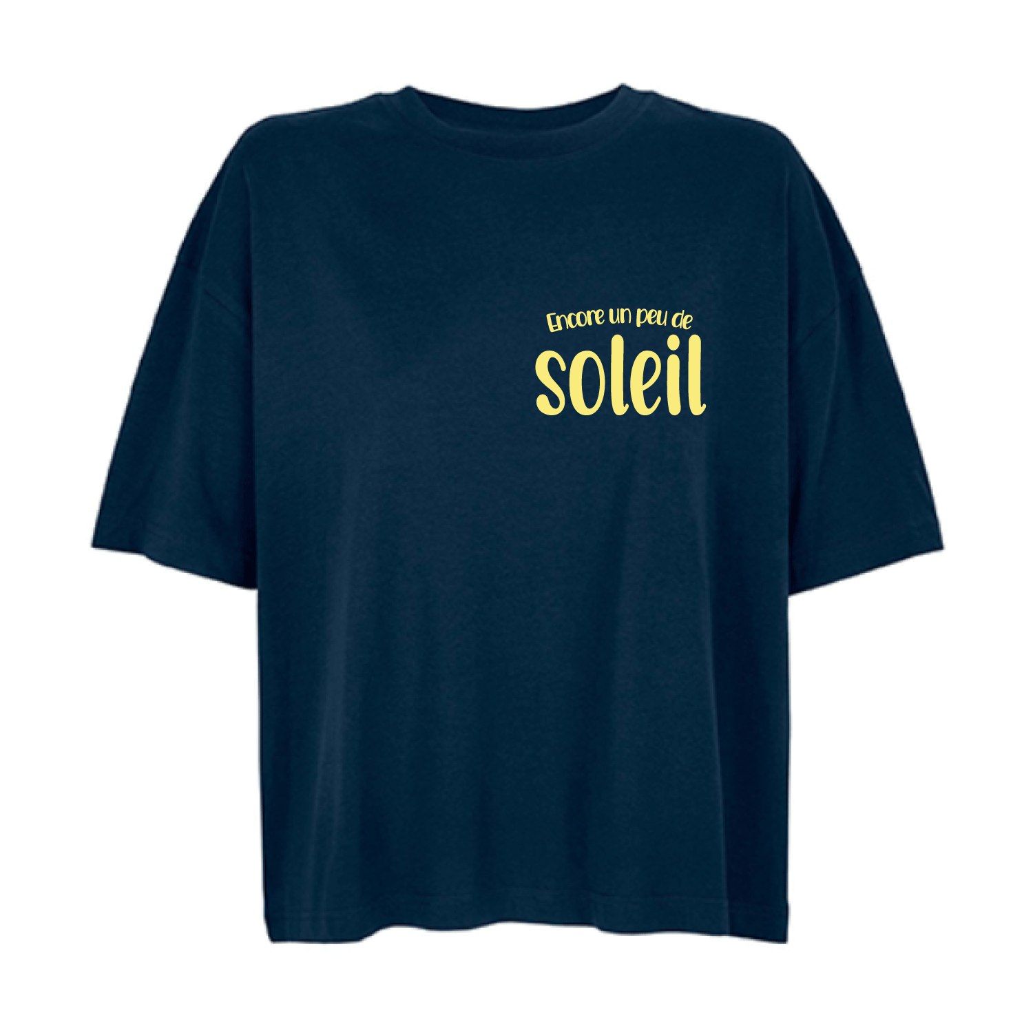 Camiseta azul marino con estampado amarillo suave "Encore un peu de soleil".